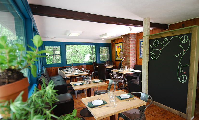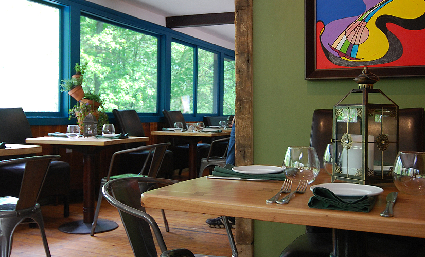 I can honestly say that I’ve only been kicked off a property during a project—here in Woodstock. This hotel was such a disaster, literally falling apart right under the owners’ feet. On this property, we reluctantly tackled the lobby and restaurant space, even though that was not what the owners were looking for, hence the request to leave. Chris Anna and his team from C+A Custom Builders were amazing troopers, so we stayed and finished the project though—clearly not wanted. I was so thrilled with how this space turned out. We found reclaimed lumber to create a mantle that suited the original stone fireplace and to frame out the new walls in the restaurant.