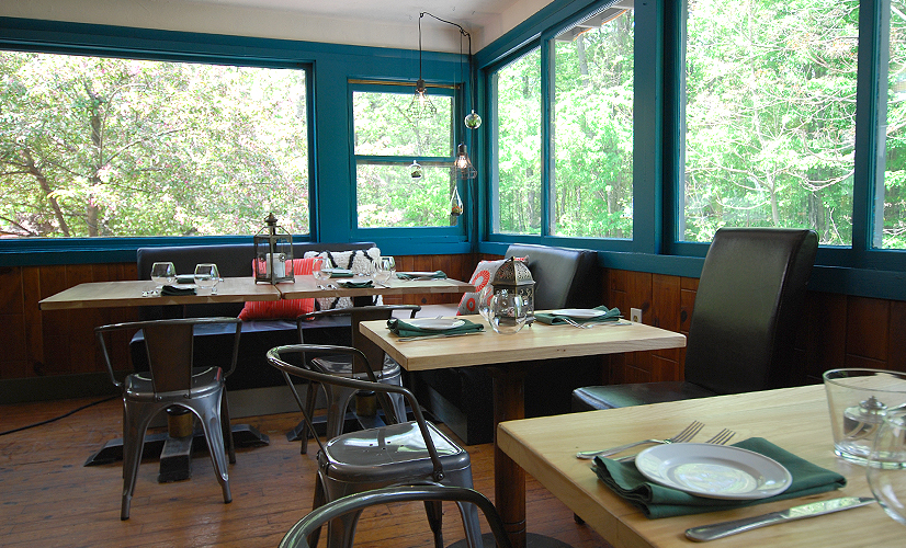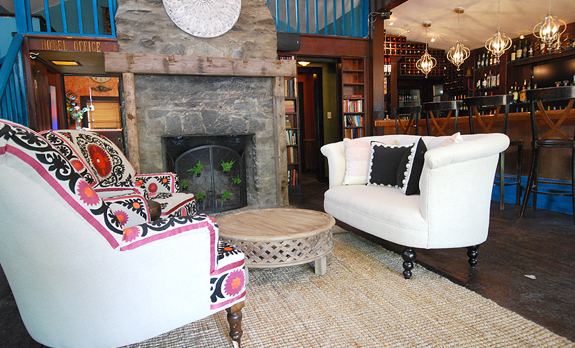 I can honestly say that I’ve only been kicked off a property during a project—here in Woodstock. This hotel was such a disaster, literally falling apart right under the owners’ feet. On this property, we reluctantly tackled the lobby and restaurant space, even though that was not what the owners were looking for, hence the request to leave. Chris Anna and his team from C+A Custom Builders were amazing troopers, so we stayed and finished the project though—clearly not wanted. I was so thrilled with how this space turned out. We found reclaimed lumber to create a mantle that suited the original stone fireplace and to frame out the new walls in the restaurant.